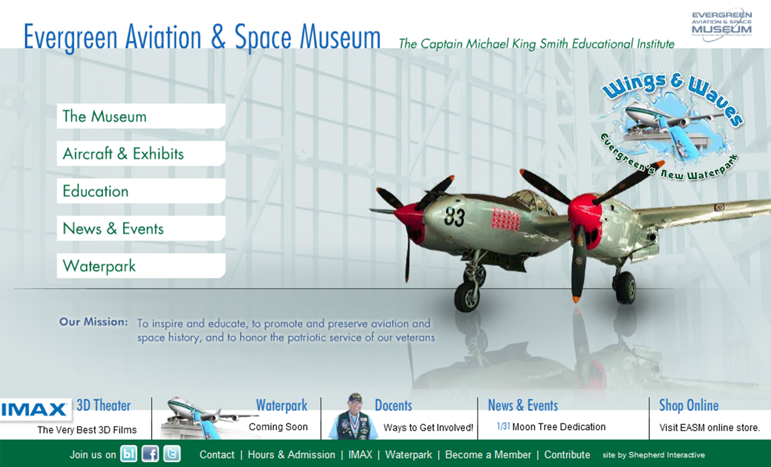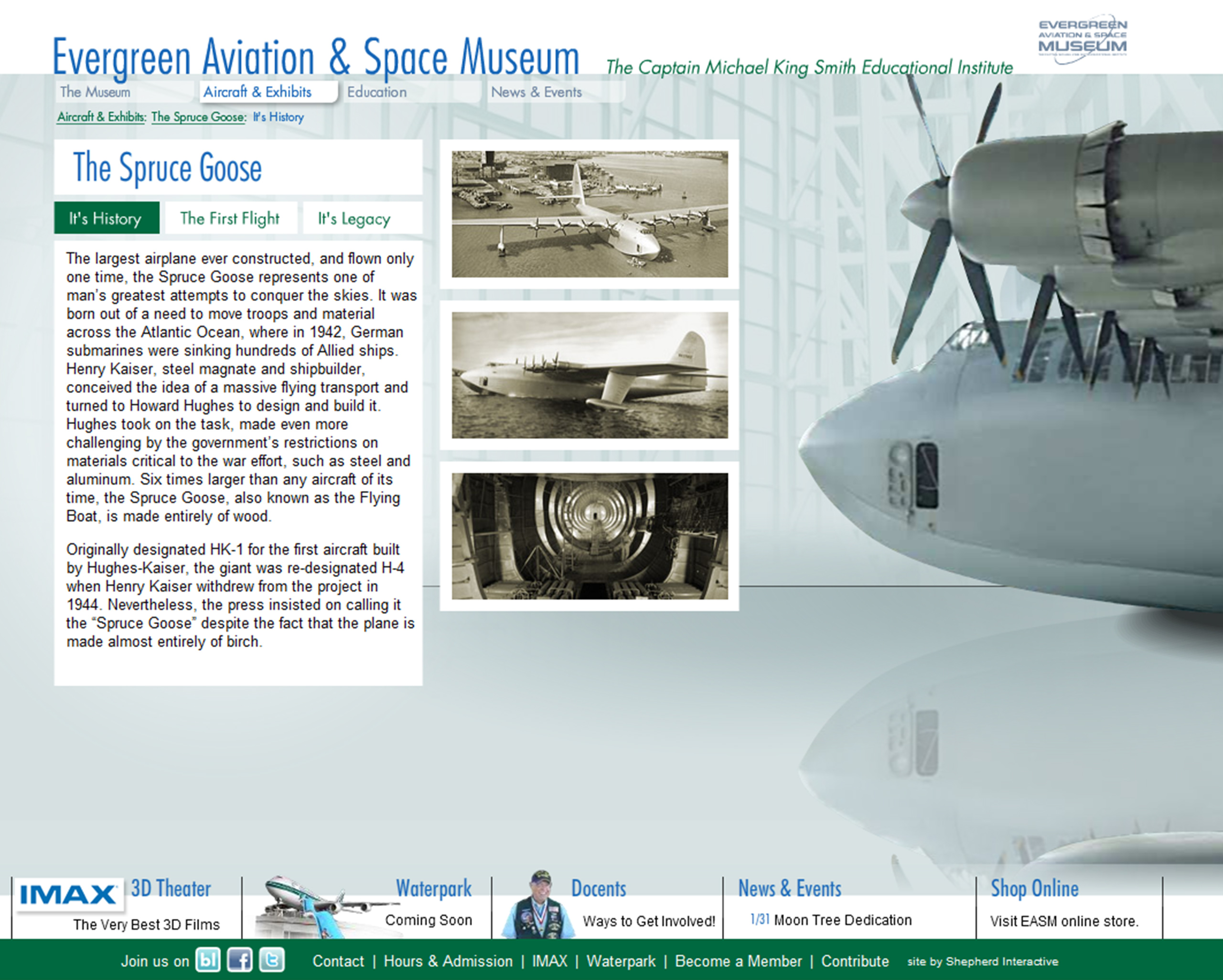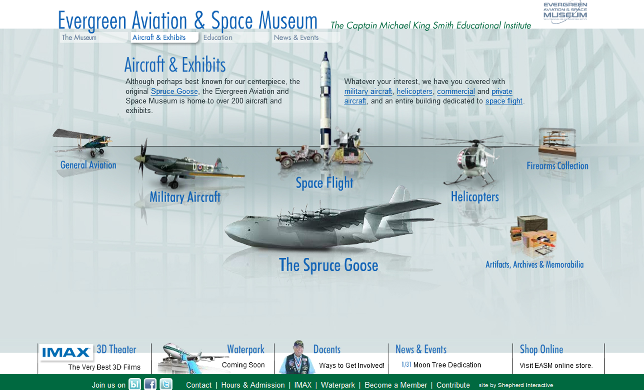 I led the complete redesign of the Evergreen Aviation and Space Museum's website, a nonprofit dedicated to showcasing a vast array of aircraft, including the iconic Spruce Goose. The new website was crafted to highlight the museum's beauty and the impressive diversity of its exhibits. Featuring highly interactive elements, the site provided deep layers of information through multiple sections, all presented in a visually stunning style. The design aimed to enhance user engagement, offering visitors a virtual experience that mirrors the awe-inspiring nature of the museum itself.