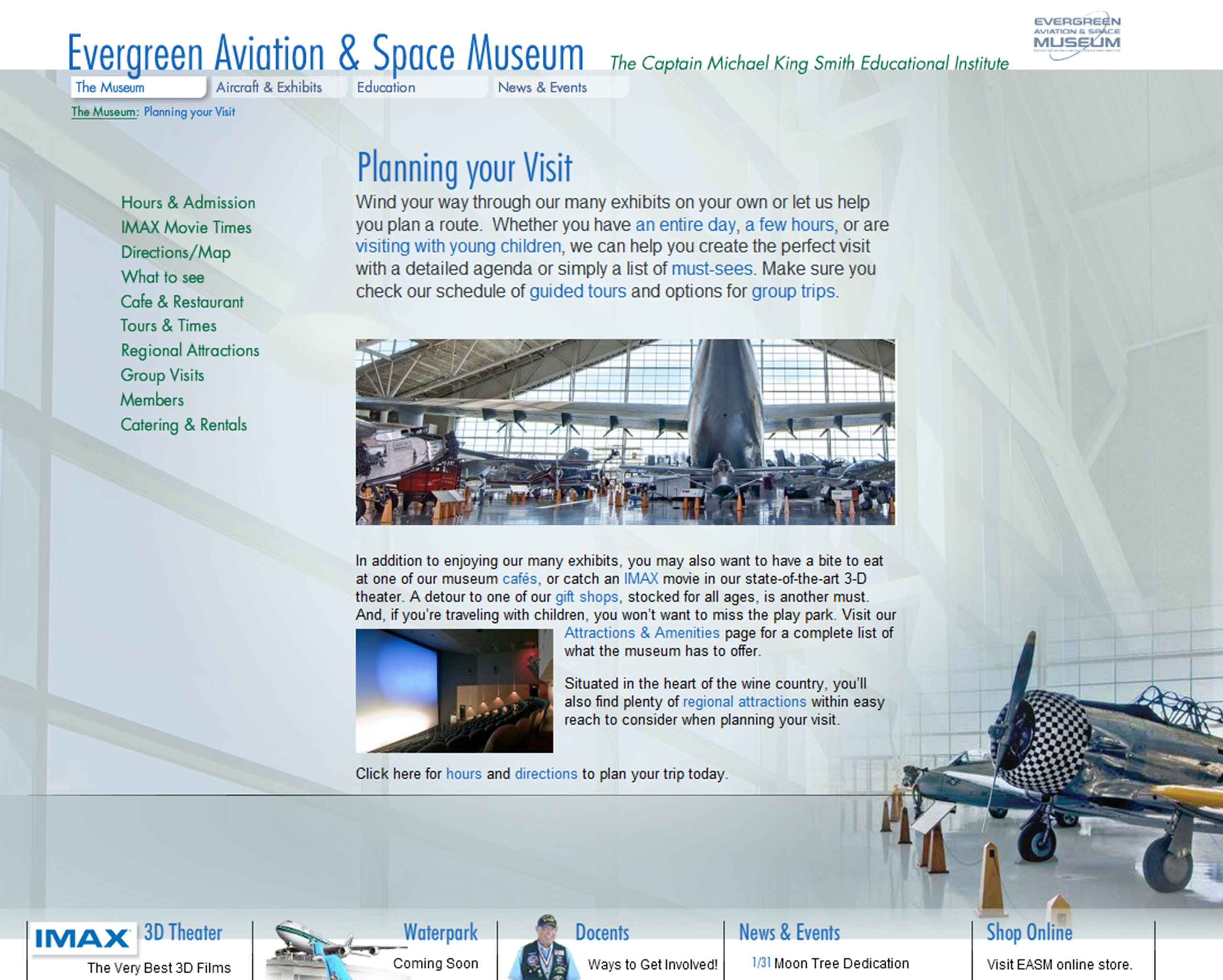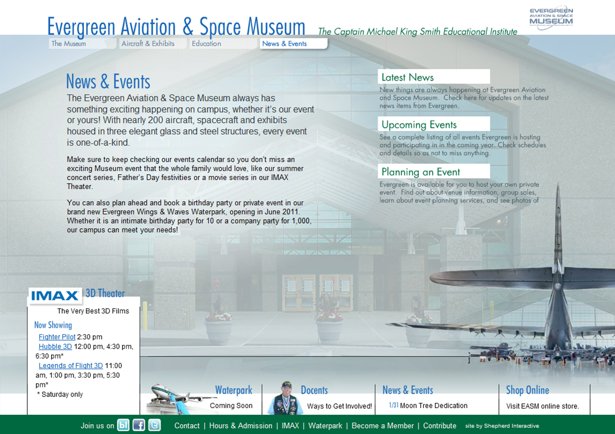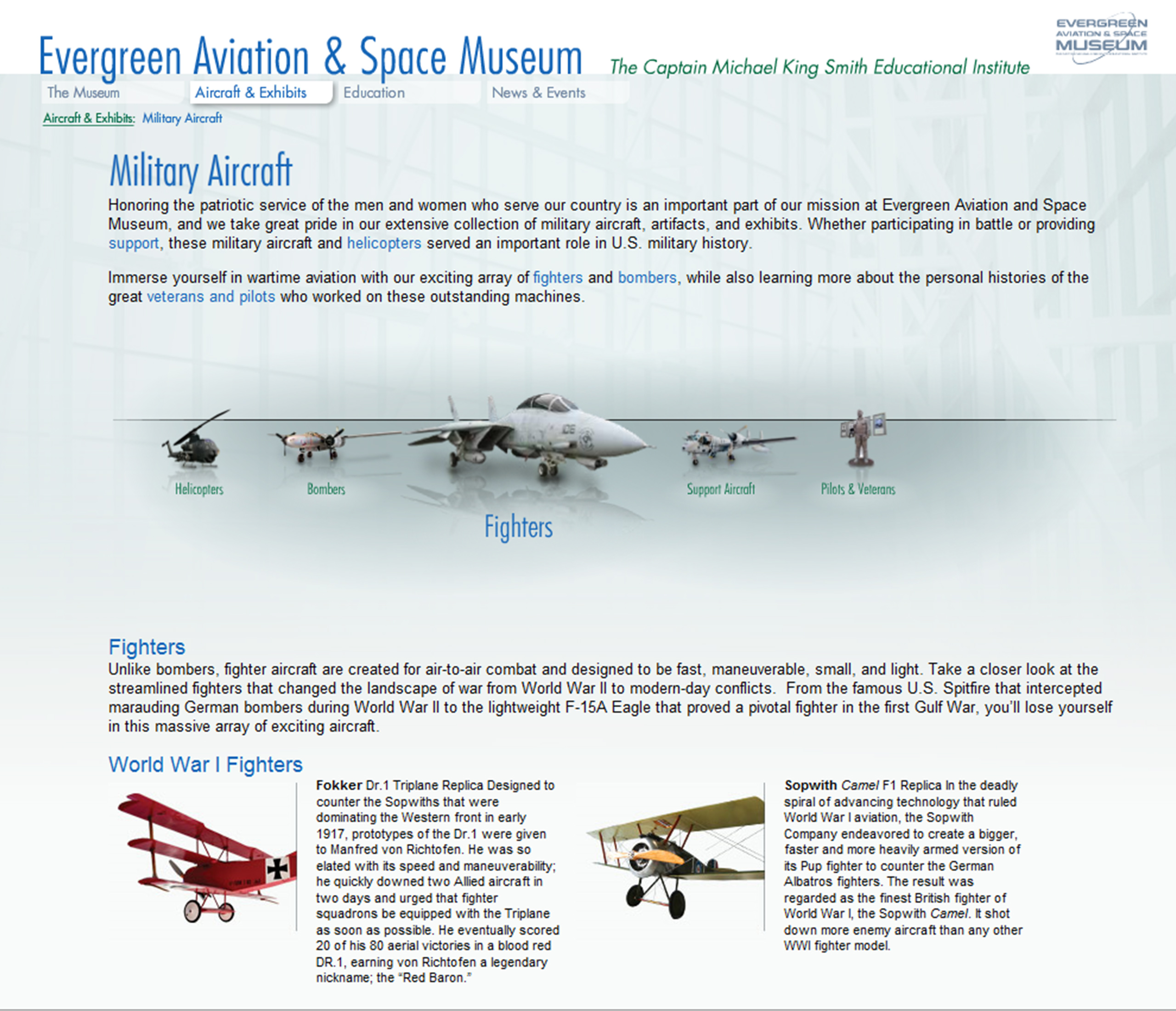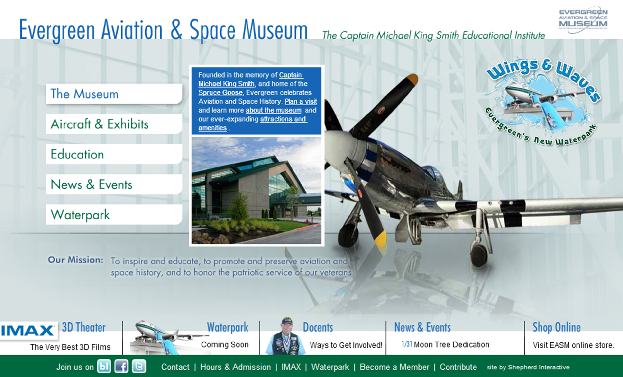 I led the complete redesign of the Evergreen Aviation and Space Museum's website, a nonprofit dedicated to showcasing a vast array of aircraft, including the iconic Spruce Goose. The new website was crafted to highlight the museum's beauty and the impressive diversity of its exhibits. Featuring highly interactive elements, the site provided deep layers of information through multiple sections, all presented in a visually stunning style. The design aimed to enhance user engagement, offering visitors a virtual experience that mirrors the awe-inspiring nature of the museum itself.